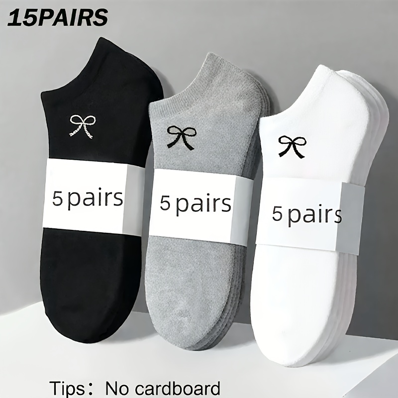 TEMU 여성용 발목 양말 15켤레 - 블랙 리본 보트 삭스, 데일리용으로 활용도 높은 봄 여름용