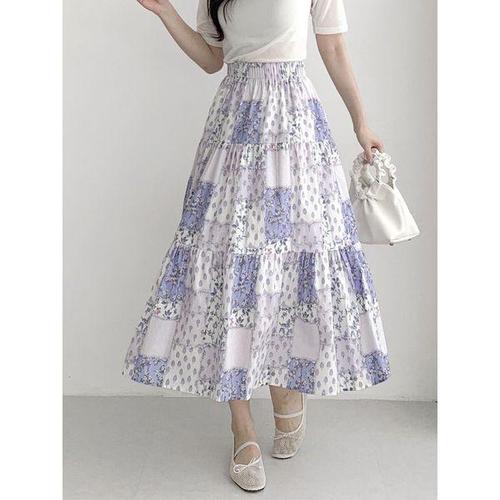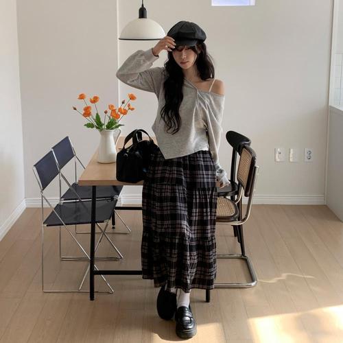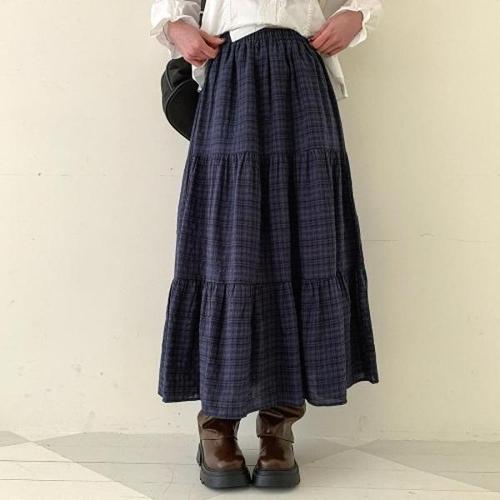 [미라클세븐]여성용 사계절 코튼 체크 롱스커트 티어드 스타일