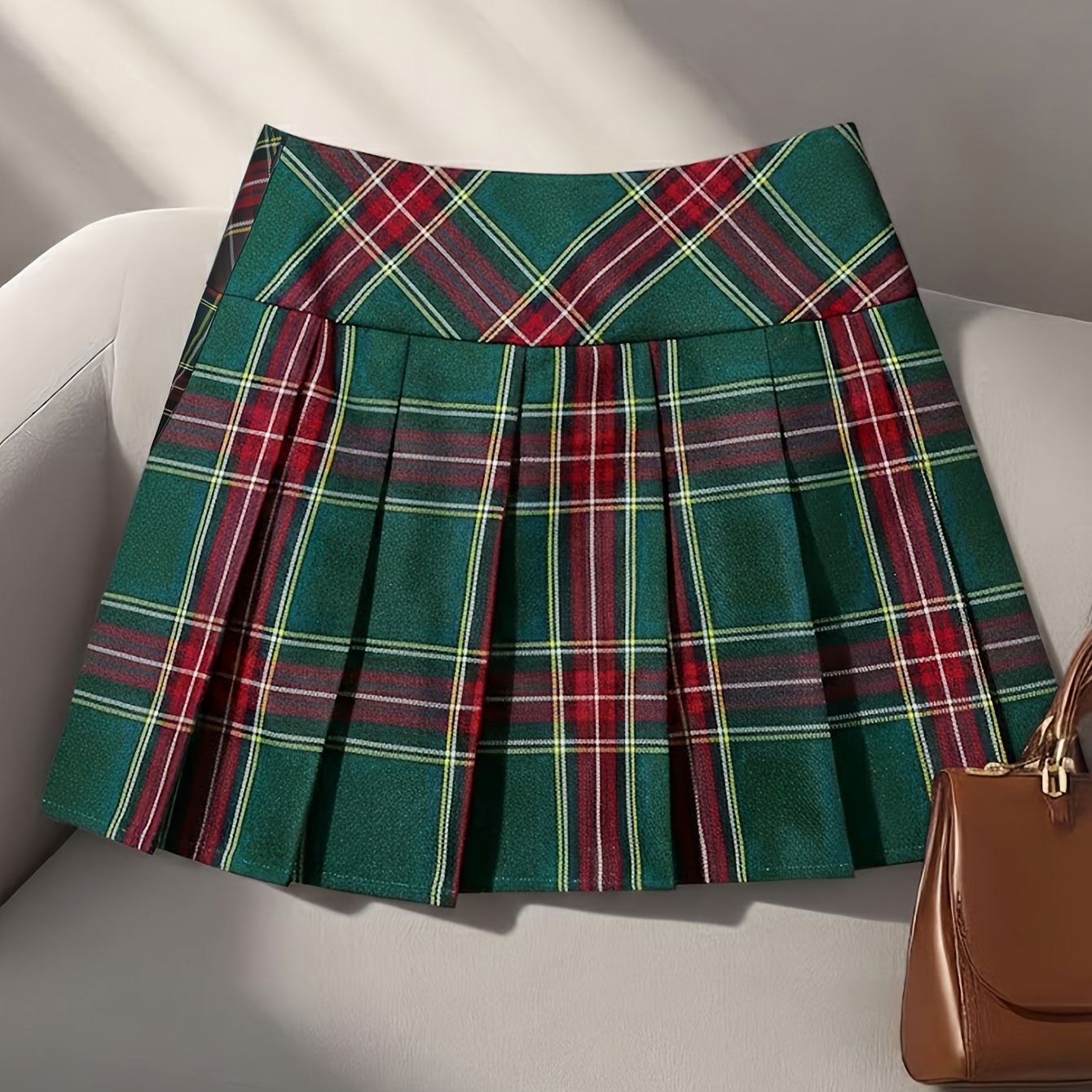 TEMU 여성용 신상 봄/여름 레드 & 그린 체크 플리츠 스커트, 하이웨이스트 페티코트