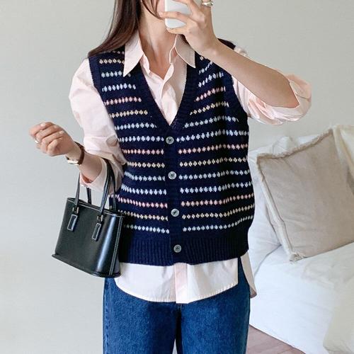 [옷자락]여자 쟈가드 무지개 패턴 단가라 브이넥 봄 니트조끼