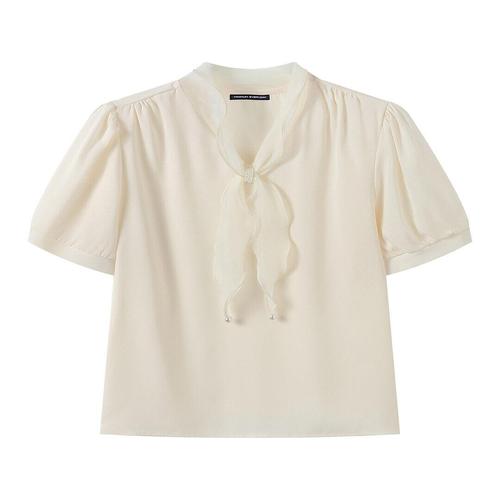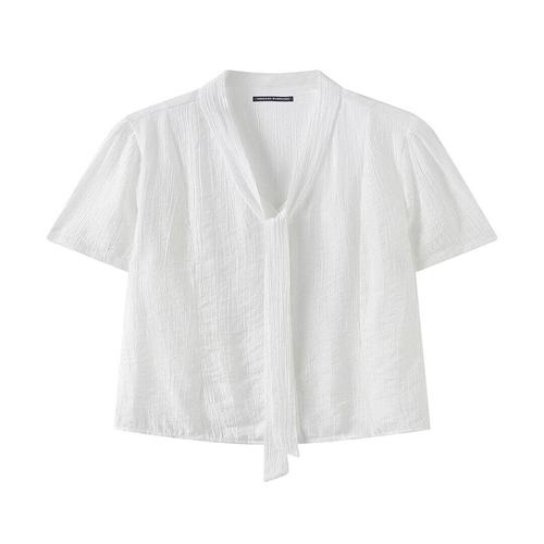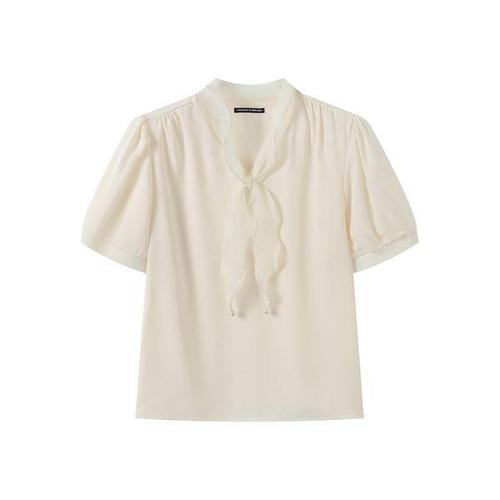 [미니멈 에브리데이]페미닌 타이넥 소매 셔링 반팔 블라우스 (EC2BA015D)