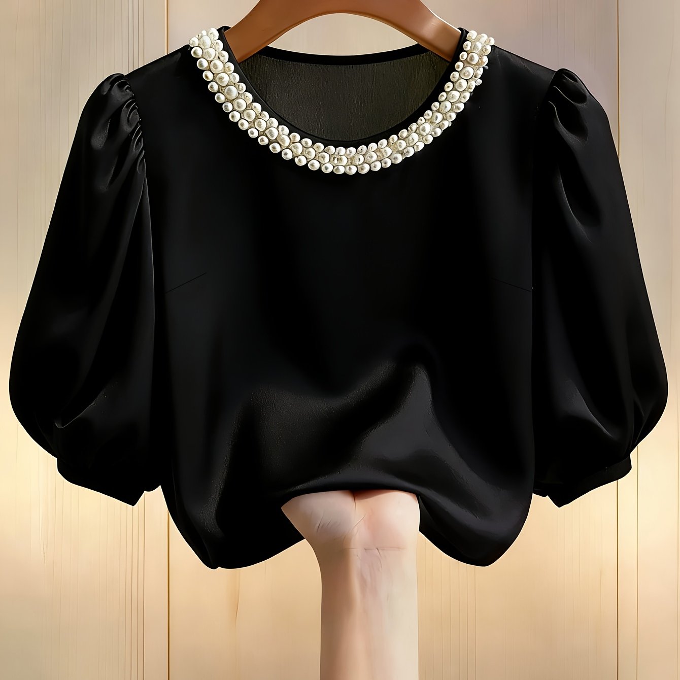 TEMU 플러스 사이즈, 플러스 사이즈 우아한 여성용 고광택 새틴 드레이프 새틴 쉬폰 라운드 넥 탑, 트리플 로우 진주 비즈 장식 및 빈티지 퍼프 랜턴 슬리브