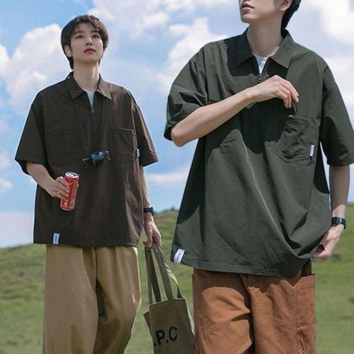 아메리칸 레트로 스웨이드 반팔 남성 티셔츠 트렌디 오버사이즈 밀리터리 그린 5부 소매 여름 루즈핏 라운드넥 티셔츠