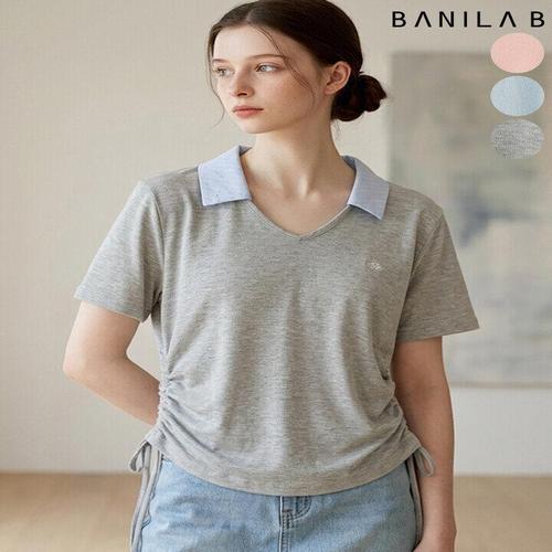 [바닐라비]여성 스트라이프 카라 옆셔링 반팔 니트