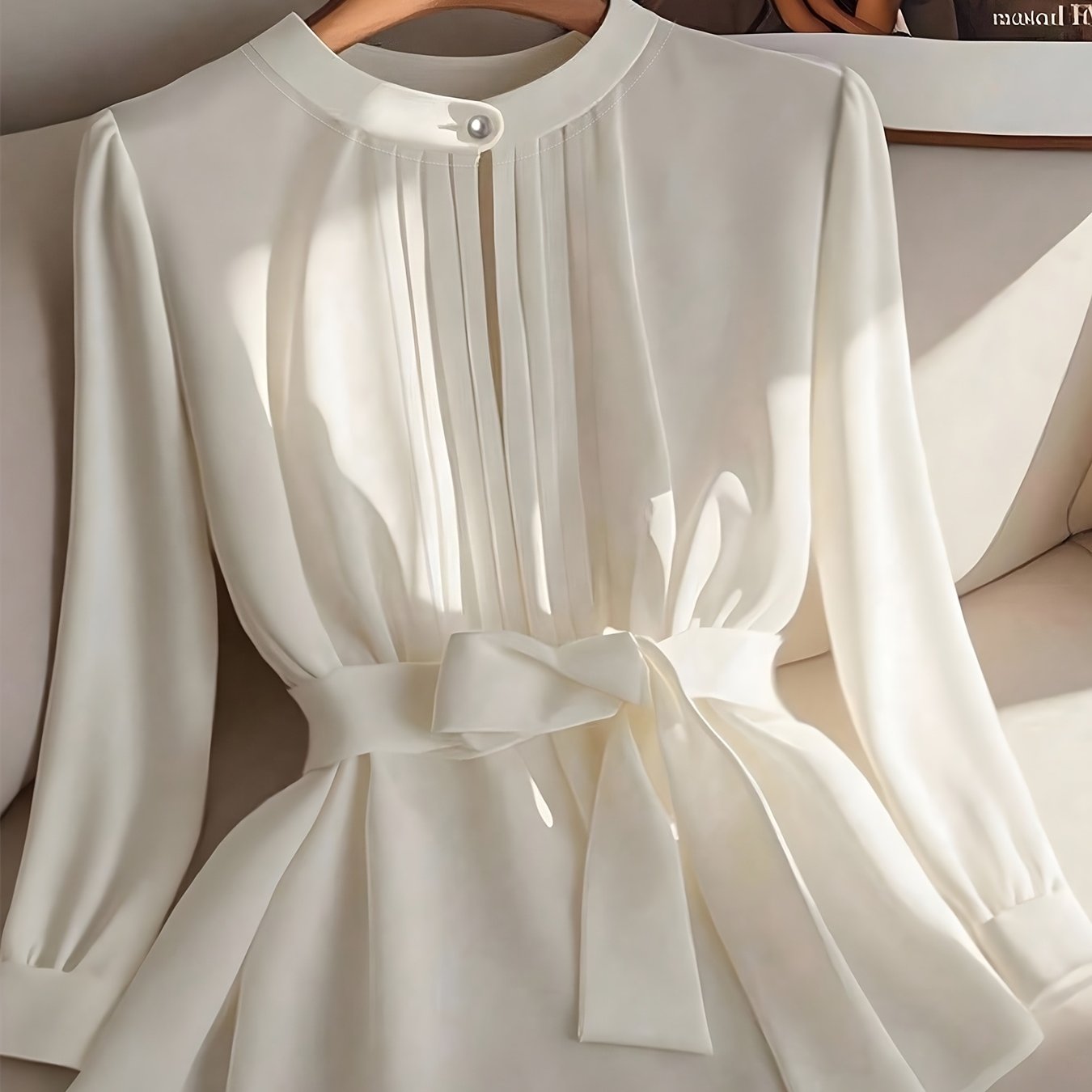 TEMU 여성용 벨티드 웨이스트 블라우스 셔츠 - 벨티드 루즈핏 라운드넥 긴소매 단색 블라우스 상의, 기계 세탁 가능, 출퇴근, 사무실 & 캐주얼 복장에 적합, 옷장 필수품