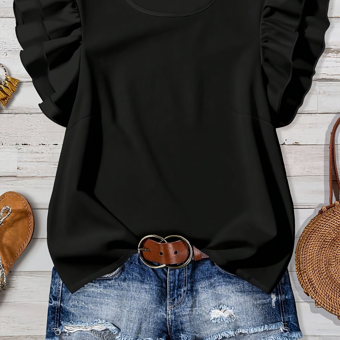 TEMU 우아한 여성용 블랙 라운드넥 이중 레이어 러플 슬리브 셔츠