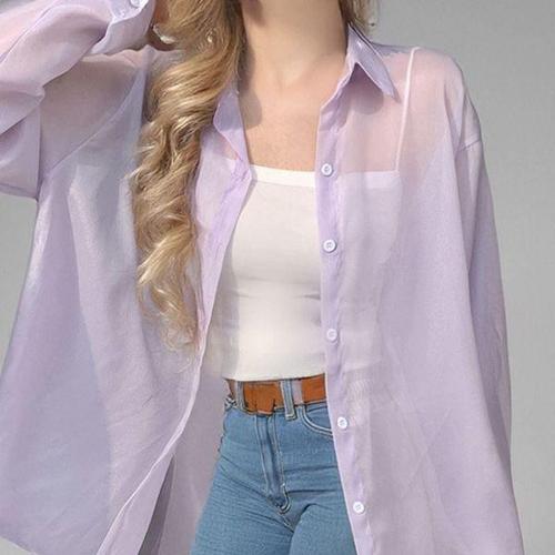 [에이치플러스몰]모리셔츠 루즈핏 카라 여름 뒤트임 시스루 셔츠 남방 빅사이즈 블라우스 얇은 바이올렛 ..