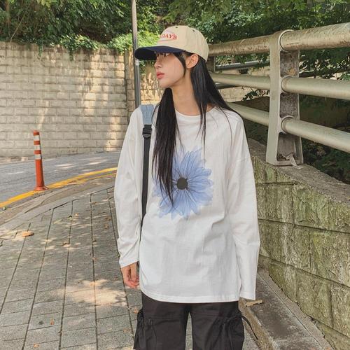 [다잇템]여자 나염 롱 꽃무늬 박스 U넥 티셔츠