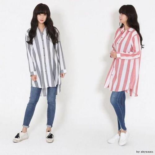 [에이치플러스몰]남자 스트라이프 롱 남방 박스 루즈핏 셔츠