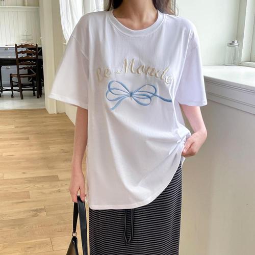 [옷자락]여자 데일리 리본 자수 박스핏 반팔 티셔츠