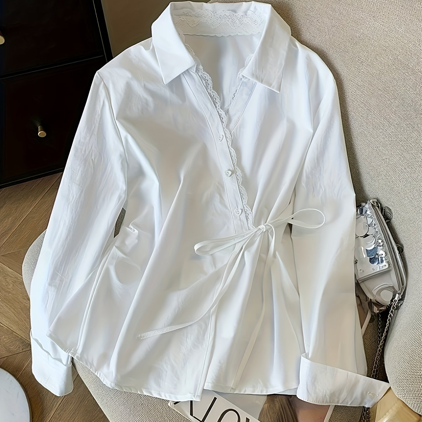 TEMU 프렌치 스타일의 섬세한 디자인! 레이스 V넥 화이트 셔츠 여성용 사이드 타이 허리 체크 탑