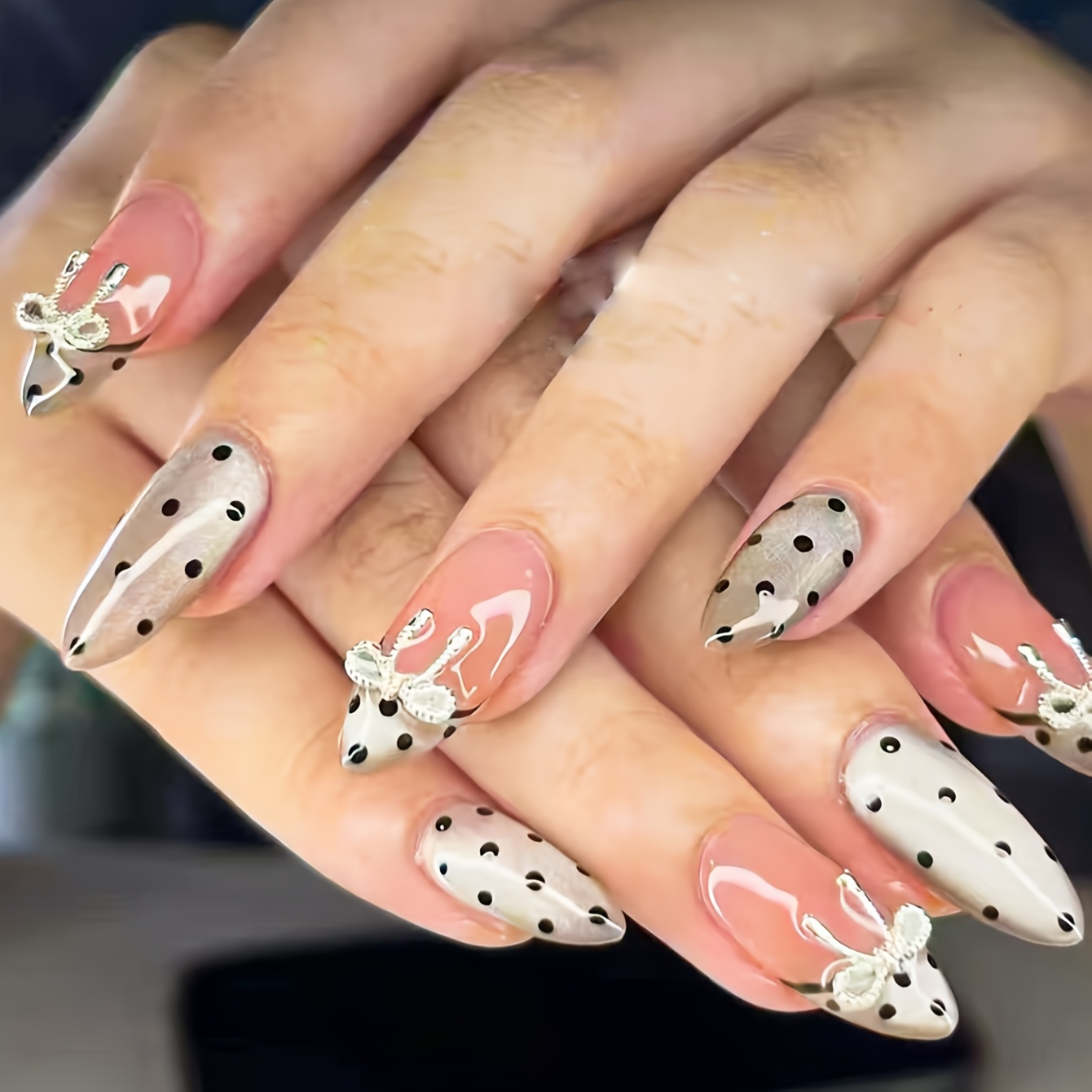 TEMU 10개 순수 핸드메이드 아몬드 프레스온 네일 세트, 은회색-갈색 폴카 도트, 보우노트 및 라인스톤 장식, 반짝이는 캣아이 효과. 정교한 재사용 가능한 예술 네일 아트, 결혼식, 데일리 사용 및 할로윈 매니큐어에 적합