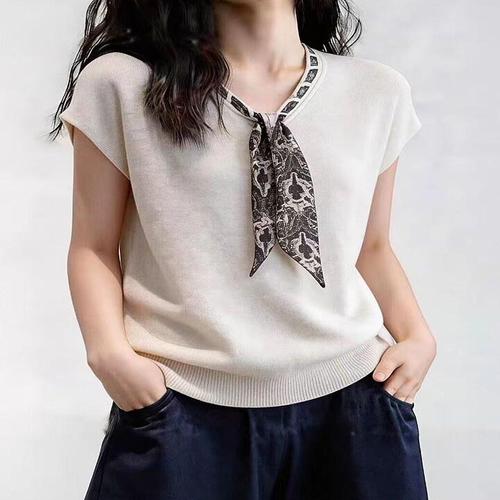 [다잇템]여자 리본 반소매 데일리 포인트 U넥 니트