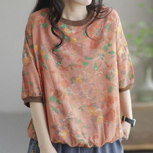 [애비뉴투지]엄마옷 스케치 플라워 퍼프소매 반팔 볼륨라인 라운드 여성 여름 블라우스 B05413