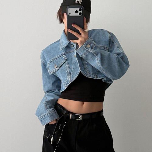 [옷자락] 여자 리벳 스터드 포켓 크롭 카라넥 스트릿 봄 청자켓