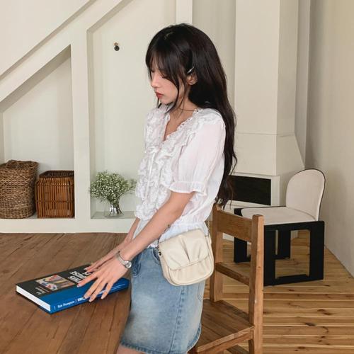 [다잇템]여자 반소매 잔주름 봄신상 레이스 블라우스