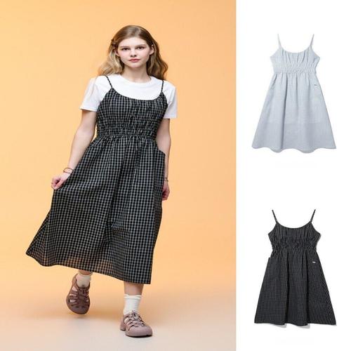 [입꼬]꼬모 빈티지 체크 스트랩 끈 나시 뷔스티에 길이조절 원피스 레이어드
