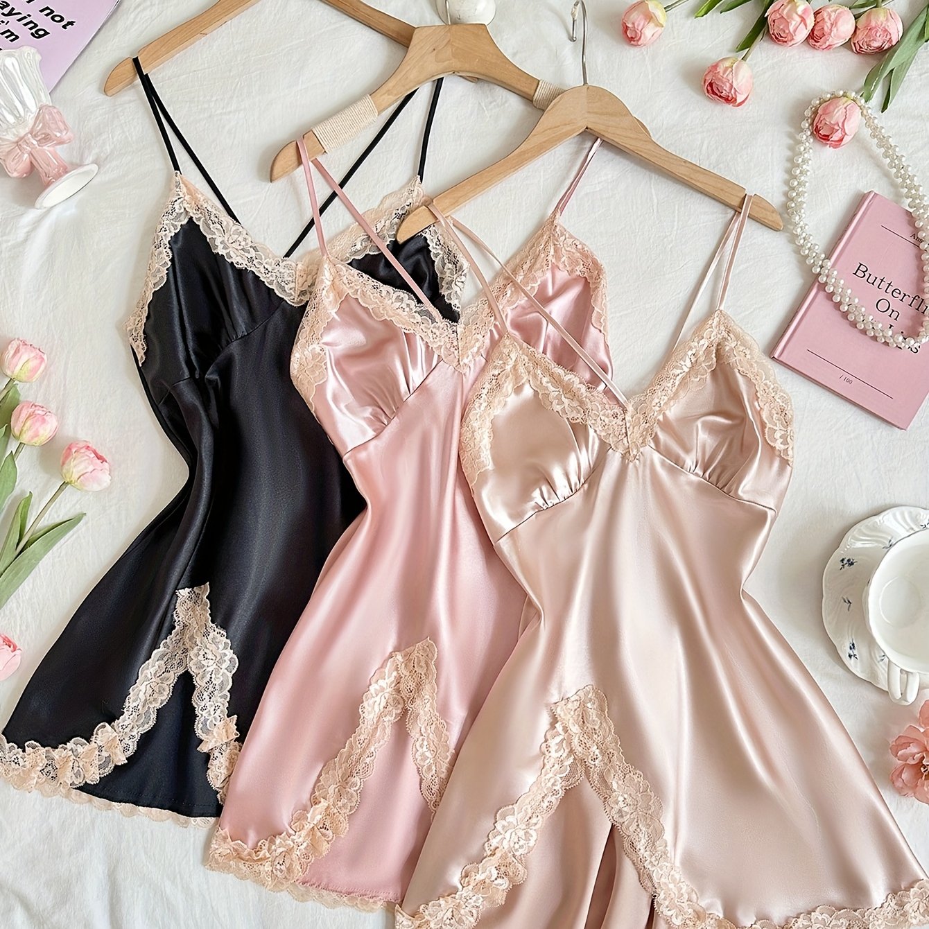 TEMU 여성 솔리드 레이스 패치워크 편안한 섹시 홈 캐미 드레스 3pcs 세트