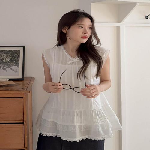 [다잇템] 여자 레이스 슬리브리스 V넥 면원단 프릴 귀여운 SS 블라우스