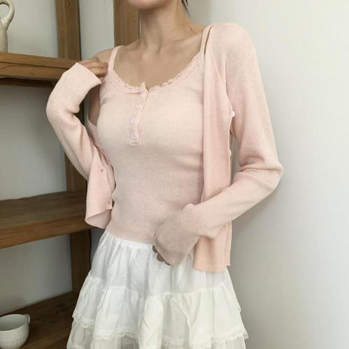 [옷자락] 여성 레이스 버튼 나시 브이넥 골지 가디건 세트