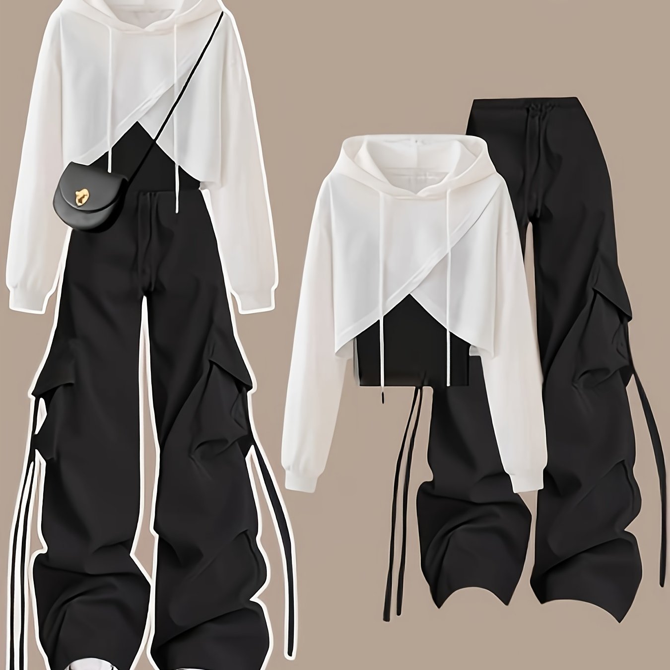 TEMU 여성 스트리트웨어 3피스 세트 Y2K 아웃핏 후드 긴팔 비정형 크로스 숏 스웨트셔츠 탑+슬링 베이직 베스트+하이웨이스트 와이드 레그 카고 팬츠 세트 하라주쿠 패션 여성 의류
