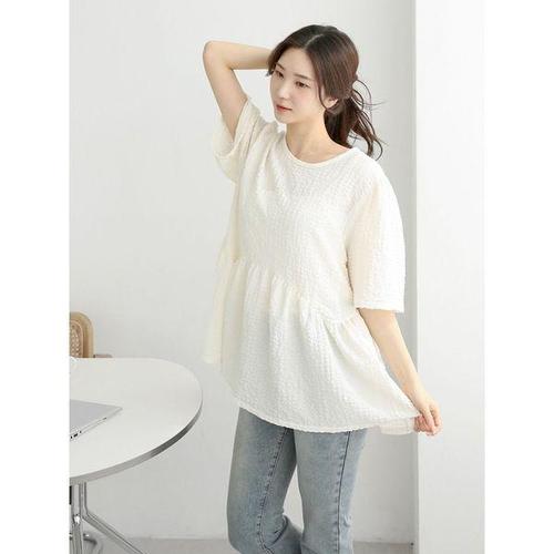 [샵앤]국산 여성 라운드 엠보 플레어 반팔 블라우스 AMI-WBL-5218-블랙