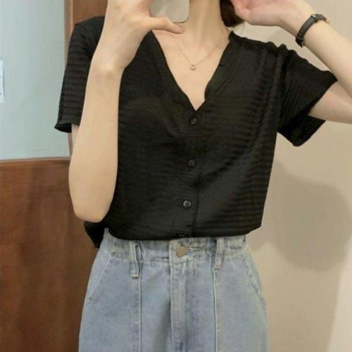 여성용 여름용 반팔 브이넥 블라우스 블랙 WFLLPYH