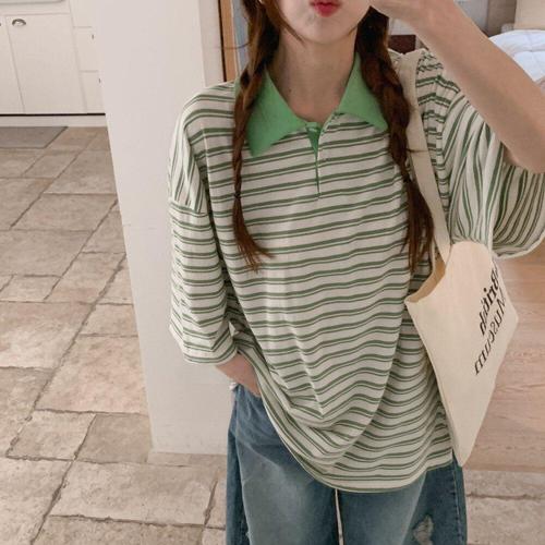 [다잇템]여성 빅사이즈 카라넥 단가라 반소매 티셔츠