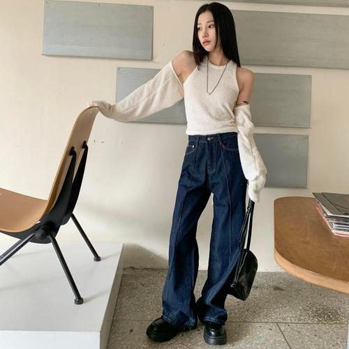 [다잇템]여자 핀턱 컷아웃 생지 넓은 데님팬츠