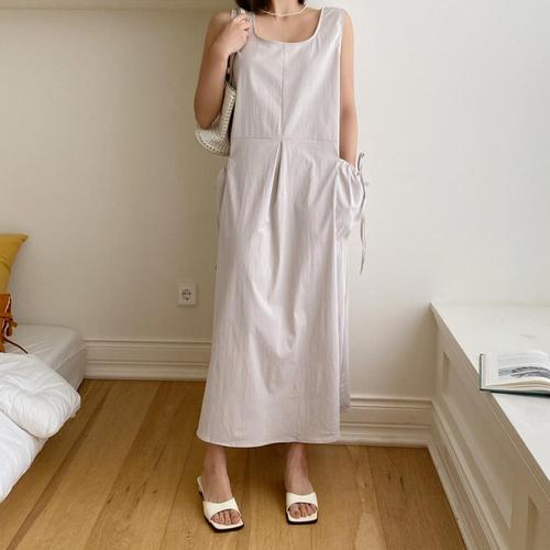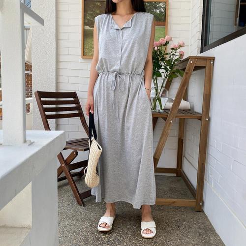 [옷자락]여자 라운드넥 스트링 셔링 포켓 민소매 롱원피스