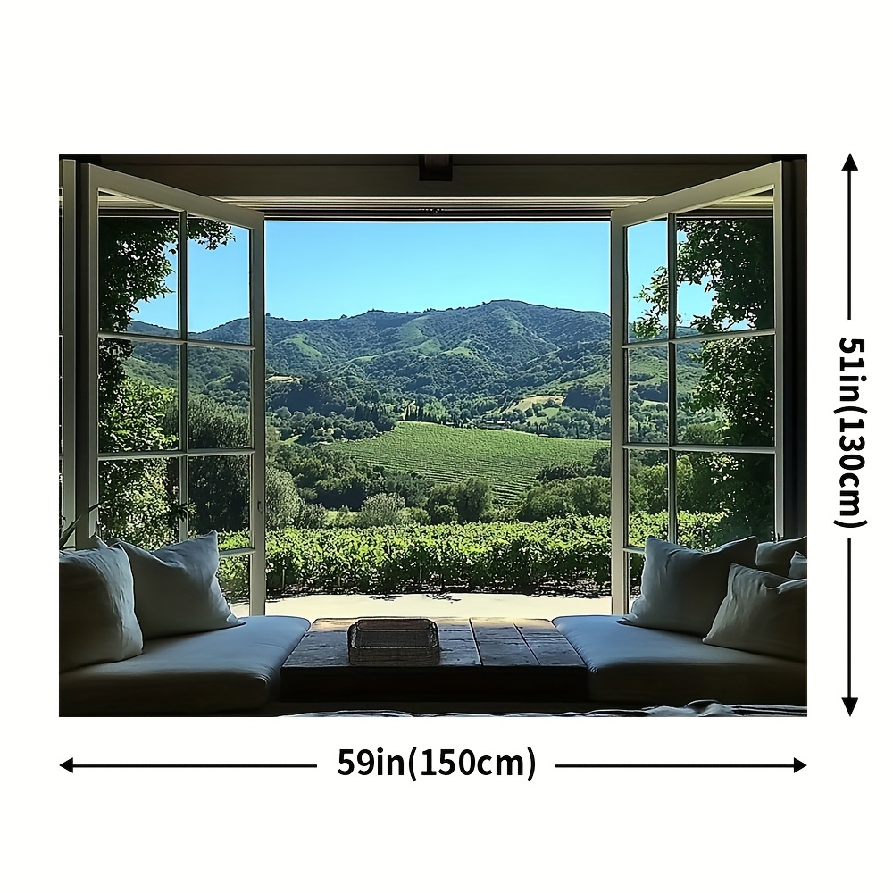 TEMU 1pc, 다용도한 봄을 소재로 한 산악 풍경 창 배경 장식, 폴리에스터 소재로 제작되어 전원 필요 없음, 연간 기념일을 위한 구멍이 있는 제품, 케이크 스매시 사진 촬영용 프로퍼