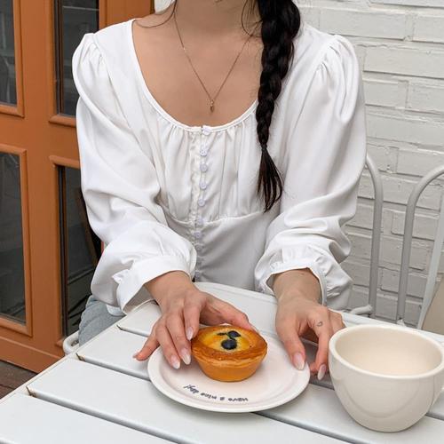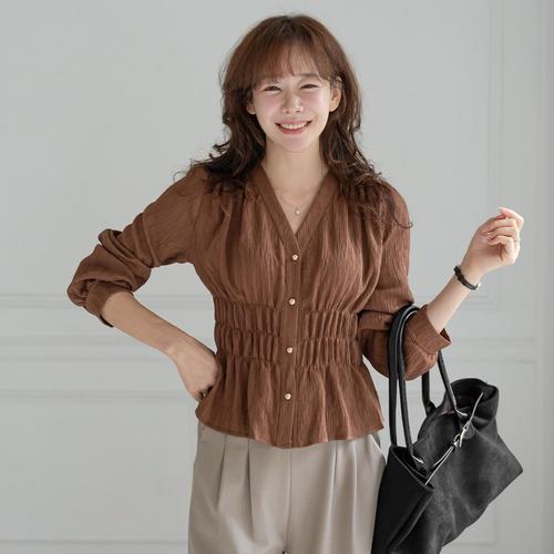 [옷자락]여자 스모크 셔링 퍼프 단추 블라우스