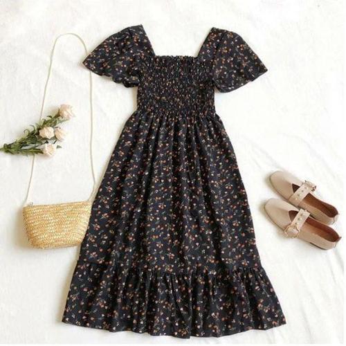 여자 스모크밴딩 플라워 퍼프 소매 원피스 URK-490