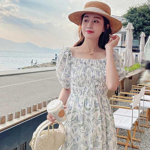 여자 플라워 패턴 스모크 스퀘어넥 원피스 URK-489