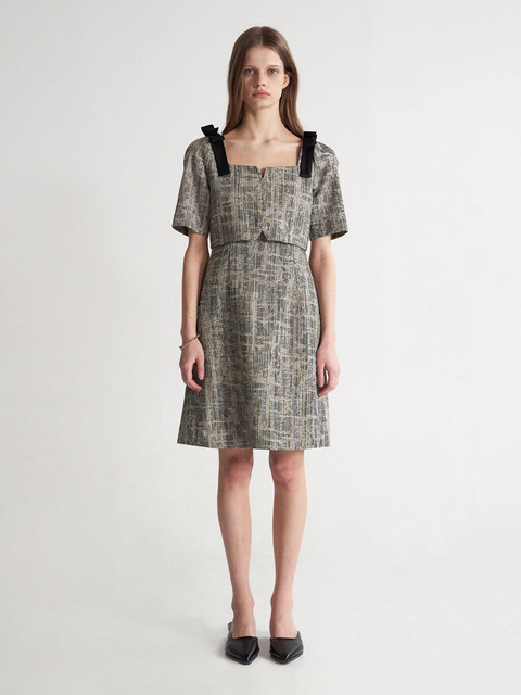 [까이에] 블랙 & 그레이 믹스 데님 스퀘어넥 리본 원피스