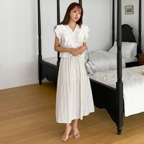 [아리엘스타일]스트라이프 셔츠라인 롱스커트투피스 리시엘투피스