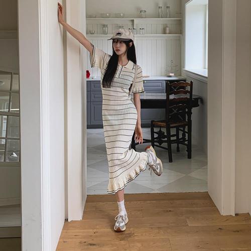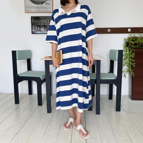 [옷자락] 여자 여름 스트라이프 카라 니트 롱원피스