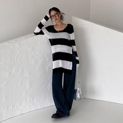 [다잇템]여자 패턴 스웨터 줄무늬 코디 U넥 롱원피스