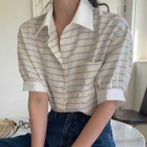 [에이치플러스몰]배색 카라 퍼프 소매 반팔 셔츠 블라우스 스트라이프