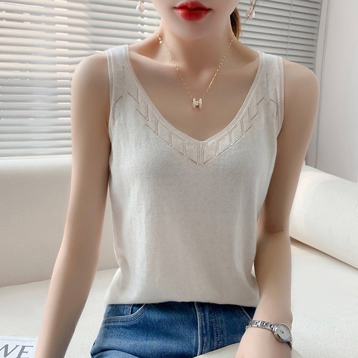 브이넥 여성 니트 나시 여름 쿨링 얇은 슬리브리스 나시티