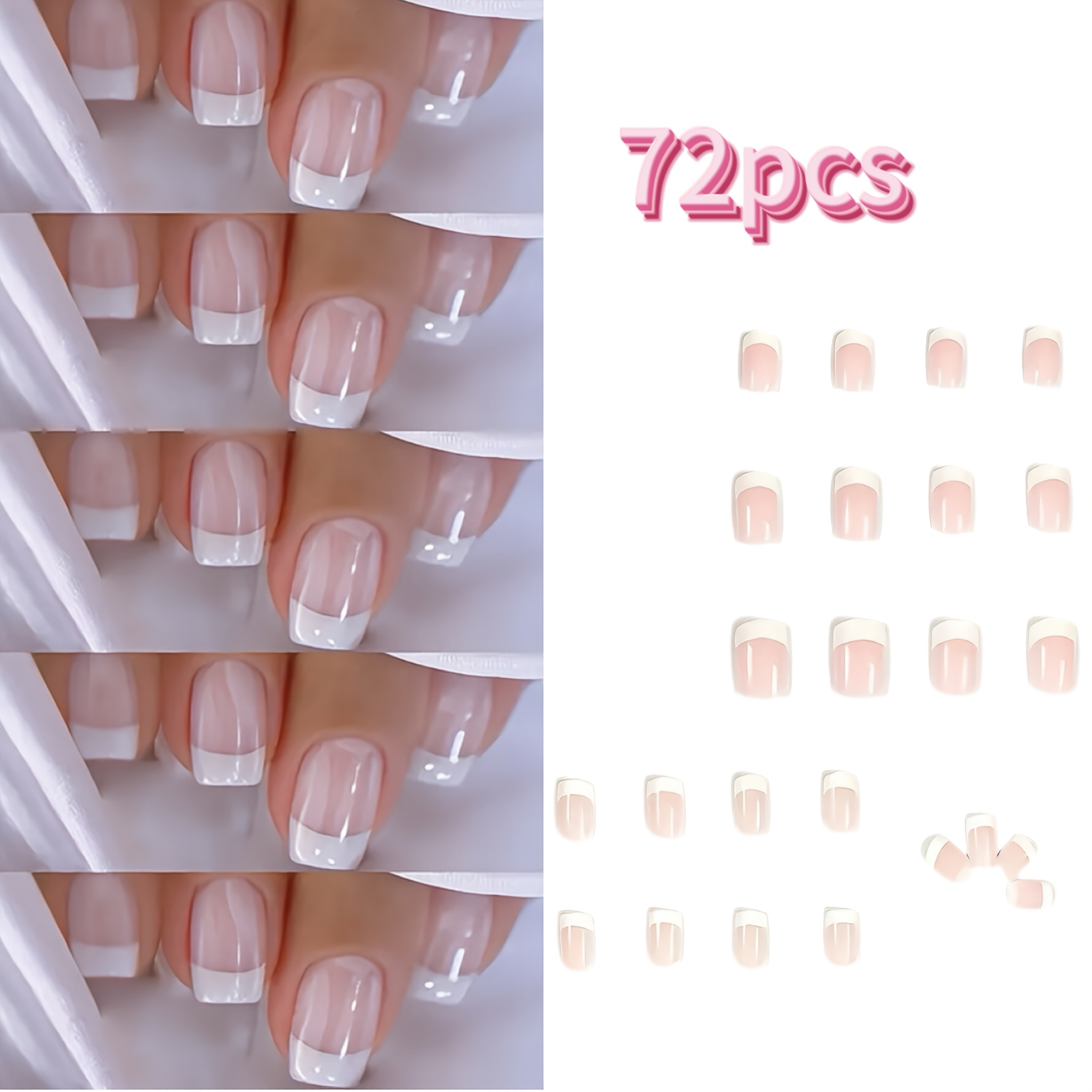 TEMU 72개입 프렌치 프레스온 네일 핑크 앤 화이트, 숏 스퀘어 아크릴 인조손톱, 여성용 재사용 가능한 네일, 파티 및 특별한 날에 적합, 간편한 부착 및 착용 (젤리 글루 및 파일 스트립)