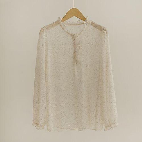 [신상오픈런]여성 도트 시스루 프릴 하이넥 소매 장식 블라우스
