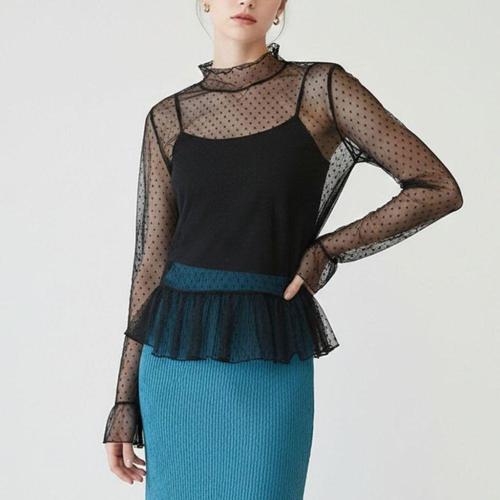 [옷자락]여성 시스루 프릴 하이넥 도트 이너 루즈 블라우스