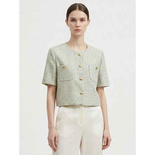 [샵앤]여성 노카라 금장단추 반팔 트위드 자켓 NARU-WJP-21179-아이보리