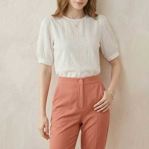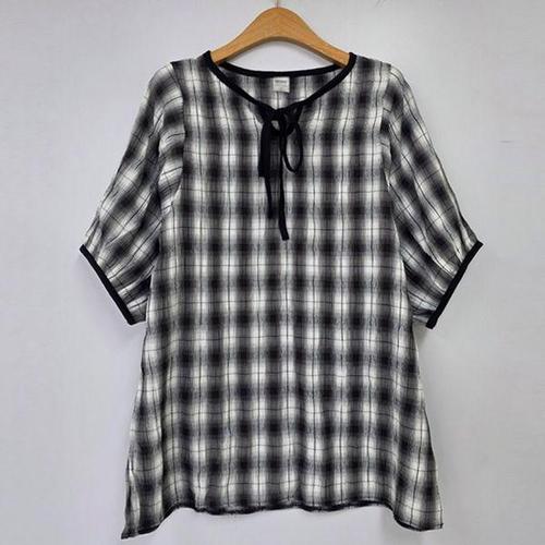 (오늘출발)아이보라-1 파우더체크티 라운드반팔블라우스