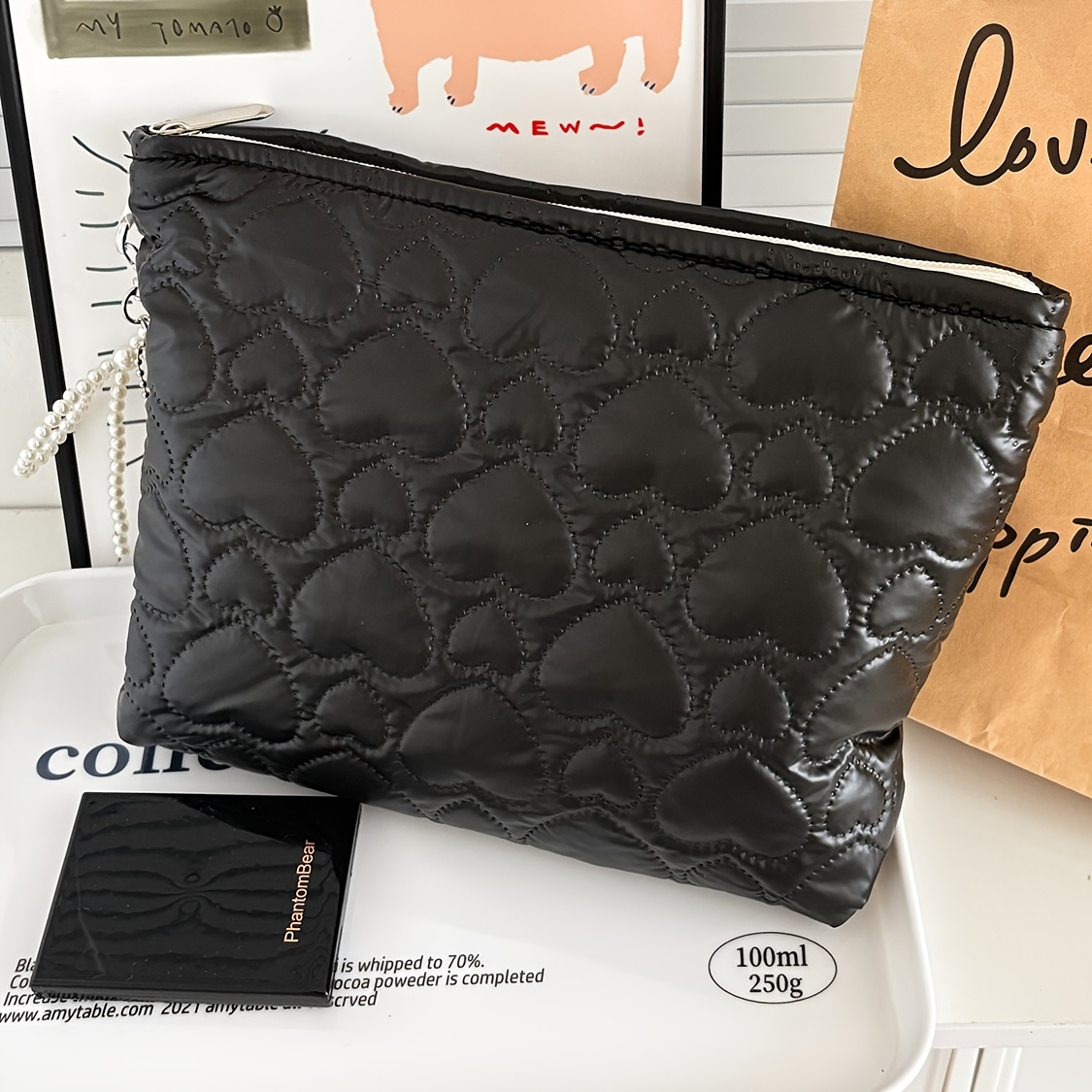 TEMU 광택 하트 퀼팅 수납 가방, 진주 리본 펜던트, 지퍼 스타일 스위트 단색 간편 꽃꽂이 수납 가방, 트렌디한 질감 휴대용 메이크업 가방, 통근자 화장품 가방, 소품 정리함, 가정 여행 데일리 여성용 범용 스타일