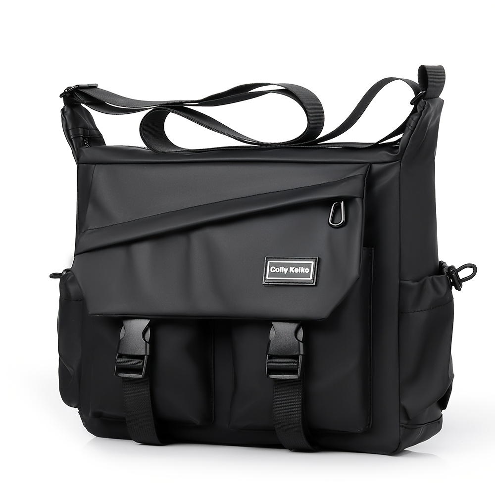 TEMU 남성용 스타일리시 메신저 백 - 블랙 및 그레이 색상으로 제공되며, 조절 가능한 스트랩, 여러 포켓, 가벼운 디자인을 특징으로 하며, 일상 사용, 여행, 직장 등에 적합합니다.