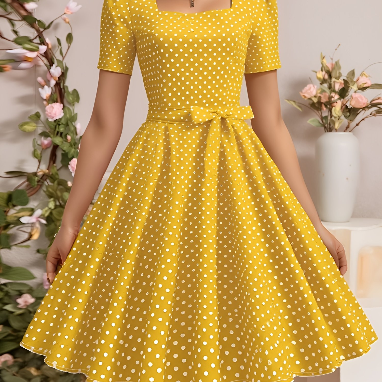 TEMU 2025 여름 신상 반팔 스퀘어넥 우아한 무릎 길이 레트로 물방울 무늬 캐주얼 모임 바캉스 해변 파티 드레스