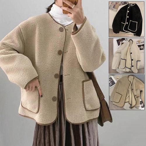 여성 캐주얼 배색 노카라 뽀글이 양털 루즈핏 카디건