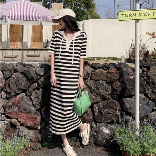 여성 스트라이프 니트 롱 원피스 여름 데일리 바닷가룩 20대용 WFLLR3Y